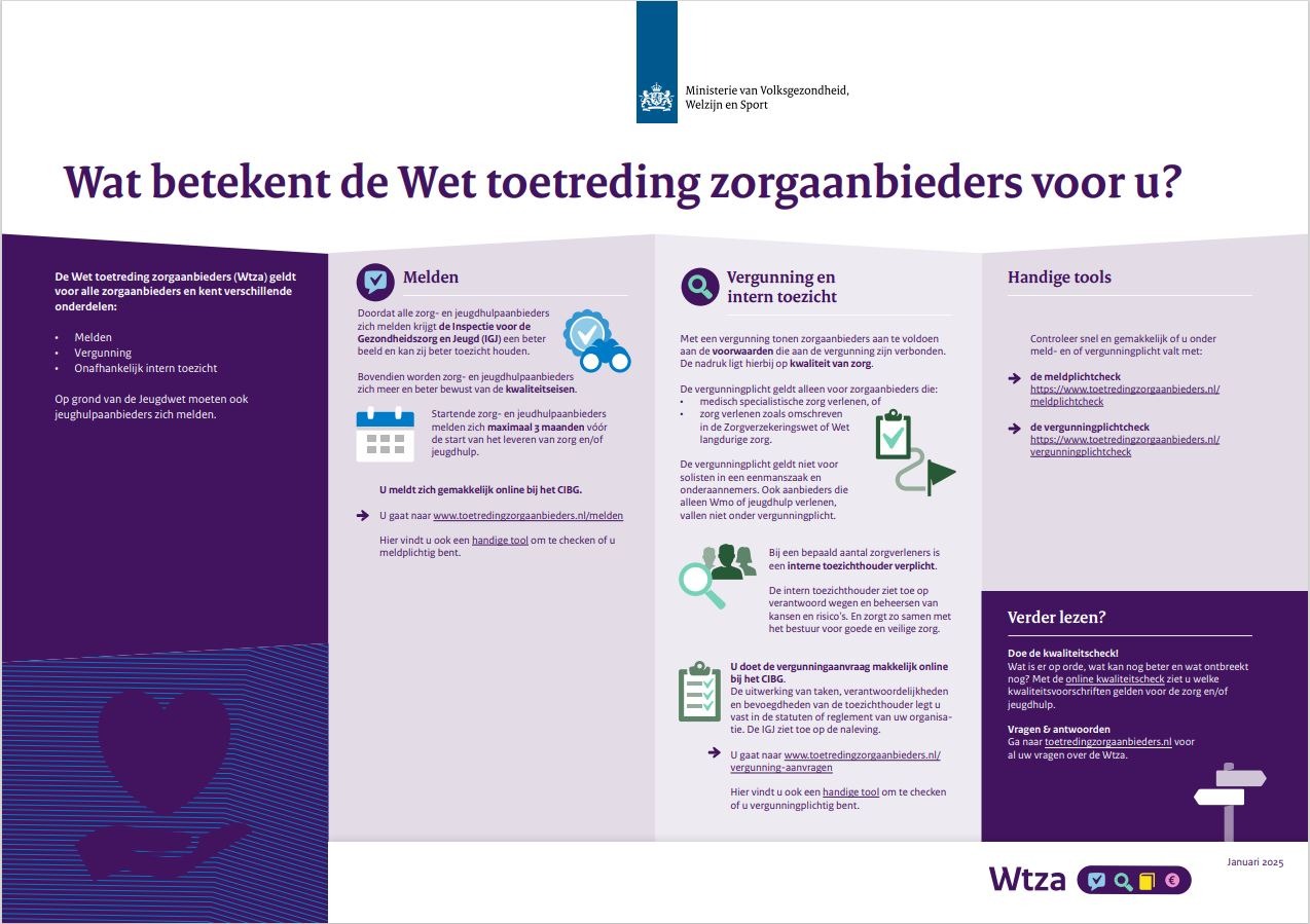 Wat betekent de Wtza (Wet toetreding Zorgaanbieder) voor u? En welke acties zijn noodzakelijk? Nagenoeg elke zorgaanbieder heeft te maken met de Wtza. De Wtza vervangt de Wet Toelating Zorginstellingen (WTZi). Het doel van de Wtza is het verbeteren van (het toezicht op) de kwaliteit van zorg. Speciaal voor jou als zorgaanbieder is een Wtza-desk opgezet, waardoor wij je nóg beter van dienst kunnen zijn.